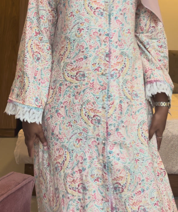 Delicately printed linen paired with lace-trimmed elegance. The Sairah set balances modest charm with modern ease — effortless, feminine, and refined in every detail.Crafted in breathable linen, it pairs a flowy long top with matching pants for an effortlessly graceful silhouette. A look that’s refined, comfortable, and uniquely yours.